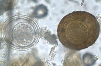 Round, dark brown eggs with thick shell and rough, uneven surface. 90-100 µm in diameter. The brown outer protein coat can detach, eggs then have a colorless, smooth shell.