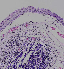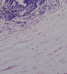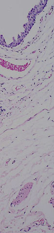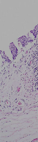 The mucosa is irregularly separating from the underlying submucosa due to post mortem autolysis.